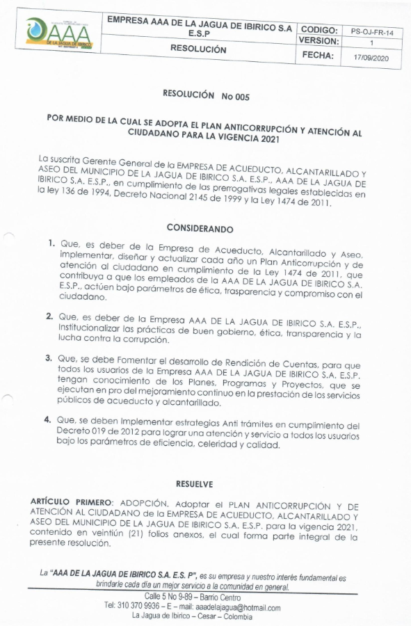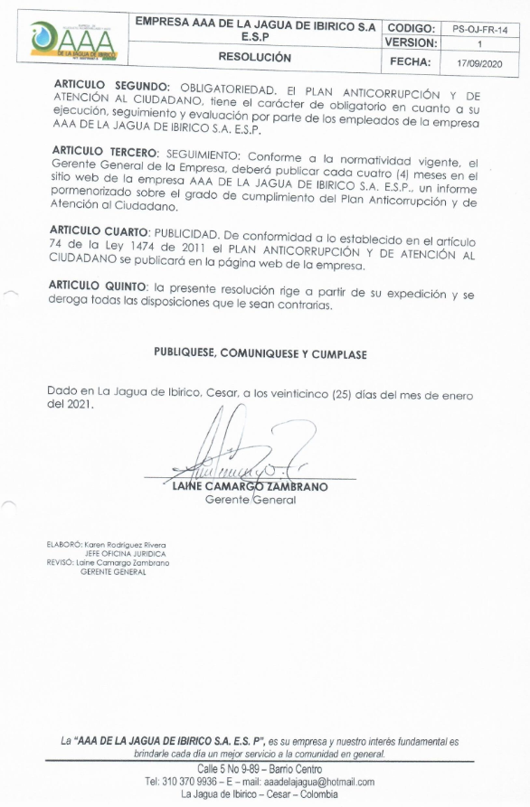 EMPRESA DE ACUEDUCTO, ALCANTARILLADO Y ASEO DEL MUNICIPIO DE LA JAGUA DE IBIRICO S.A. E.S.P. – CESAR